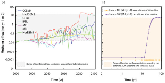 Range of benthic methane emissions predicted using (a) different climate models (colour coded) under the IPCC climate scenario RCP 2.6 at 420 m water depth west of Svalbard, and (b) a reaction-transport model that simulates a transient scenario in which a methane advective flow of 10 cm is imposed at the bottom of the sediment column at 0 years, and where a biomass-implicit bimolecular AOM rate is used with two different kinetic constants (, see Section 3.2). During the first 12 years of simulation (panel b), the effect of the imposed methane advective flow on methane efflux is null because time is required for methane to be transported up to the sediment-water interface. The initial difference in methane efflux for the two AOM scenarios (purple and orange lines prior to 12 yr) is caused by the distinct values of used to compute the corresponding AOM rates. After 12 years, and only for the less efficient AOM scenario ( = 10, purple line), a fraction of the additional advected methane escapes the bio-filter, increasing the methane efflux until a steady state is reached after 70 years. With highly efficient AOM ( = 10, orange line) all the methane is consumed within the sediment and no methane efflux is estimated regardless of the boundary condition applied. CCSM4: The Community Climate System Model version 4, HadGEM2: Hadley Centre Global Environment Model version 2, GFDL: Geophysical Fluid Dynamics Laboratory model, IPSL: Institut Pierre-Simon Laplace model, MPI: Max Planck Institute model, MRI: Meteorological Research Institute model, NorESM1: Norwegian Earth System Model part 1. Adapted from [31,41].