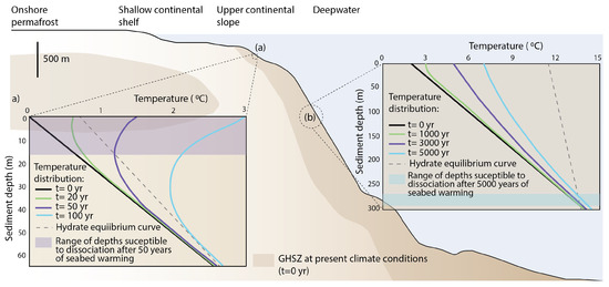 Schematic cross-section of a high-latitude ocean margin divided into four distinct zones where hydrate might be found. Insets show the response of hydrate reservoirs located at (a) 320 m water depth and exposed to a linear increase in bottom-water temperature of 3 °C over 100 years, and (b) 1000 m water depth and exposed to linear bottom-water warming of 1.25 °C over 5000 years. In shallow reservoirs (a), hydrate destabilisation likely initiates at the very top of the reservoir facilitating methane transport to the ocean (purple shaded area). For deep hydrates (b), destabilisation likely initiates at the base of the reservoir (blue shaded area) with a time delay with respect to the onset of warming at the seafloor caused by heat transport through the sediment column. Note that the original simulations assume that hydrate destabilise when the ambient temperature exceeds the equilibrium curve (grey dashed line), and ignore the heat absorbed during destabilisation. GHSZ: gas hydrate stability zone. Modified from [33,66].
