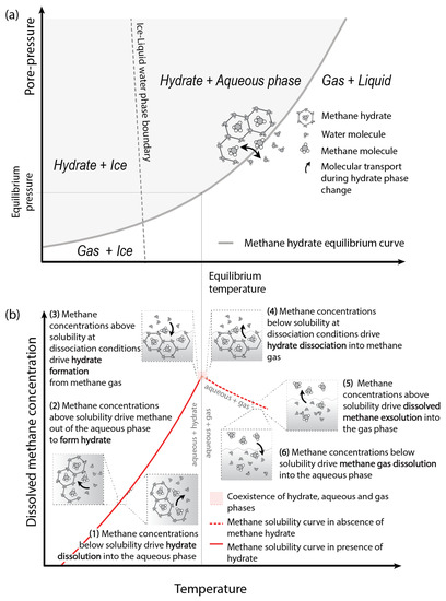 Hydrate destabilisation is generally driven by pressure and temperature perturbations (i.e., pressure-temperature shifts towards the right side of the hydrate equilibrium curve, solid grey line in Figure 4a), pore-water under-saturation in dissolved methane (Figure 4b) or an increase in water salinity [74]. During this process, the local temperature of the system decreases due to the endothermic nature of the reaction and the pore-water salinity decreases due to the release of fresh water. This cooling, together with the pore-water freshening may result in secondary hydrate or ice formation, which reduces the permeability of the reservoir [75] and may favour short-term hydrate self-preservation against warming. In addition, and depending on the sediment’s permeability and its ability to dissipate pore pressure, the release of liquid water and methane gas (in the case of dissociation) may increase the sediment pore pressure [76]. Pore-pressure increase can play two different roles in the reservoir. On one hand, it may favour hydrate stability. On the other, especially in low-permeability, fine-grained sediments, excess pore-pressure can lead to sediment fracturing (e.g., [77,78]), thus facilitating methane escape towards the seafloor [44,46]. In addition, as hydrate destabilisation progresses, the pore-scale distribution of phases (i.e., pore-volume ratio occupied by the different solid, aqueous and gas phases) evolves, leading to large changes in the reservoir’s permeability and the multiphase flow behaviour [79]. The resulting flow characteristics will control methane transport and significantly influence the amount of dissolved methane available for microbial consumption [56].