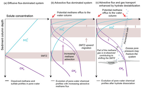 Conceptual representation of sulfate () and methane () fate within the sediment column at (a) diffusive and (b,c) advective flux-dominated settings. Note that hydrate dissociation favours methane pore-water over-saturation and therefore gas occurrence and potential sediment fracturing. Adapted from [99].