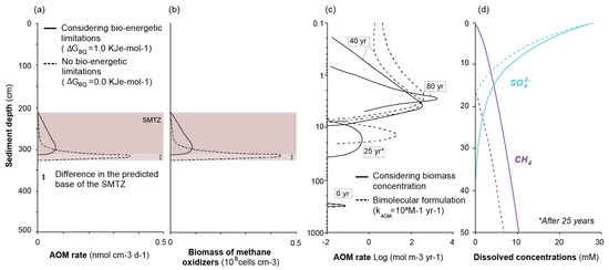 A similar behaviour can be predicted by models accounting for both the kinetic and bio-energetic driving forces governing the net growth rate of biomass (Figure 7c,d) (see Section 3.2). In particular, Regnier et al. [43], show that the reduction of the AOM rate due to biomass dynamics is more pronounced just after the onset of the fluid flow (i.e., 25 years after the initiation of the simulation in Figure 7c) because of the movement of the SMTZ to shallower depths. These results also evidence how the decrease in the AOM rate translates into an increase of sulfate and methane concentrations in pore-water in the sediment column (Figure 7d), which can favour methane efflux to the ocean.