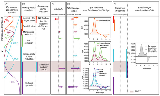 Idealised profile showing depth distribution of (a) pore-water geochemical zonation, (b) main primary and secondary redox reactions occurrence, (c) alkalinity fluxes, (d) pore-water pH/carbonate saturation state (Ω), and (e) carbonate precipitation/dissolution occurrence. Note that the secondary columns (d,e) show the distinct effect of the different chemical processes presented on pH changes () as a function of ambient pH. The sign change in some of these highly non-linear functions denotes that the direction and magnitude of pH change according to the initial pH conditions. Sizes of the arrows in columns (c,d) are qualitative indicators of the magnitude of the effect of each biogeochemical path on alkalinity, pH, and Ω. OSR: organoclastic sulfate reduction; AOM: Anaerobic oxidation or methane; DOC: dissolved organic carbon; DIC: dissolved inorganic carbon.