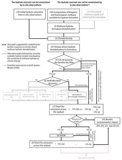 In black, ideal model flow suggested for assessing the benthic response to climate-driven methane hydrate destabilisation. In grey, alternative paths followed by currently available hydrate models investigating the sensitivity of methane hydrate to climate change (see Table 3). Box numbers relate to the scientific questions presented in Section 3.1 and can also be linked to Table 3. Note that estimated values of aqueous methane by-passing the AOM bio-filter may differ by several orders of magnitude according to the formulation applied to compute the AOM rate (see Section 3.2 and Figure 2 and Figure 7d). () Refers to those simulation cases where in situ data are not available to constrain the hydrate reservoir, including the reconstruction of past scenarios. : Methane, (aq): Aqueous phase, (g): Gas phase, AOM: Aerobic oxidation of methane, AeOM: Anaerobic oxidation of methane, DIC: Dissolve inorganic carbon, TA: Total Alkalinity, : Dissolved oxygen, : Authigenic carbonate, ESMs: Earth system models.