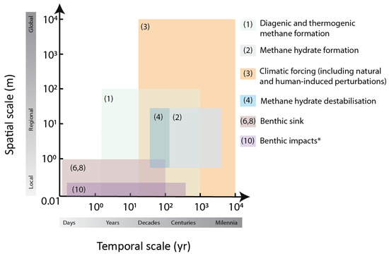 Illustration of the processes that contribute to methane formation/consumption within the sediment column with respect to their temporal and spatial scales. Numbers can be related to those in Figure 9. Note that temporal scales are better constrained than spatial ones due to the wide spatial distribution at which the illustrated processes can take place. In addition, note that hydrate phase change scales are specific for the context of climate forcing. () Benthic processes with long time scales impacts (>1–10 years) could refer, for example, to the precipitation of thick crusts of authigenic carbonate (>10–20 cm) or significant pH decrease in pore-water via AeOM.