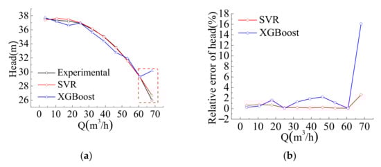 Two sets of single-stage single-suction centrifugal pumps with specific speeds of 46.2 and 90.7 were used to verify the applicability of the PSO-XGBoost prediction model and were compared with the PSO-SVR prediction model. The comparison results are shown in Figure 9 and Figure 10, respectively.