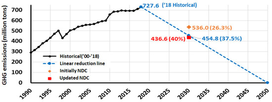 Historical GHG emissions, emission target of Korea, and 2050 net-zero [6].