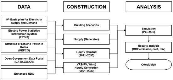 The simulation input data are constructed based on the official announcement of the 9th BPE, and historical data from the Electric Power Statistics Information System (EPSIS) of Korea Electricity Exchange (KPX), Korea Electric Power Corporation (KEPCO), and Open Government Data portal, as described in Figure 2 and Table 1.