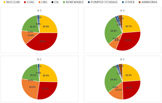 Figure 7 shows the total generation costs of all scenarios. The total generation costs in 2030 for B-1, C-1, and D-1 increased by 109.8%, 113.6%, and 109.2%, respectively, when compared to scenario A-1. To meet the CO2 emission target, generation mode operation of pumped hydro storages was increased in D-1.
