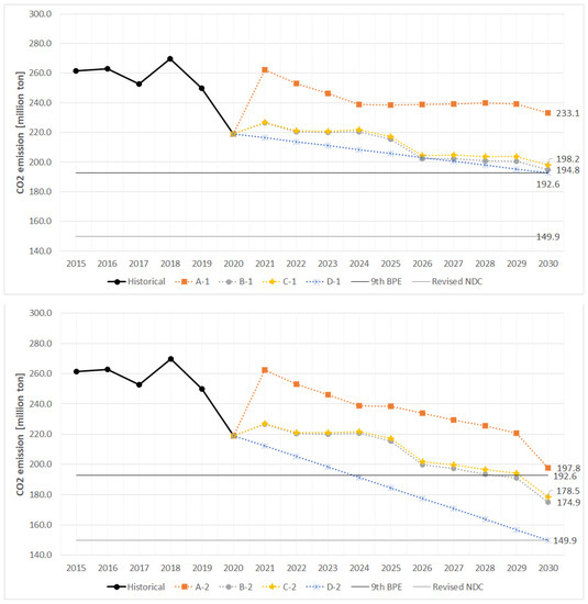 Although electricity demand increased in the X-2 scenarios, the effect of increasing renewable energy was greater, and CO2 emissions in the X-2 scenarios decreased compared to those in X-1 scenarios. In 2030, scenario A-2 expects 197.8 million tons, but it will fall short of both the 9th BPE and the updated NDC targets. This means that it is difficult to achieve emission targets by only increasing renewables, so additional reduction measures must be adopted. In scenarios B-2 and C-2, the 9th BPE’s target was achieved, but not the target of the updated NDC. The CO2 intensity of electricity generation in 2030 is calculated to be 0.330, 0.294, 0.300, and 0.253 kgCO2/kWh in X-2 scenarios.