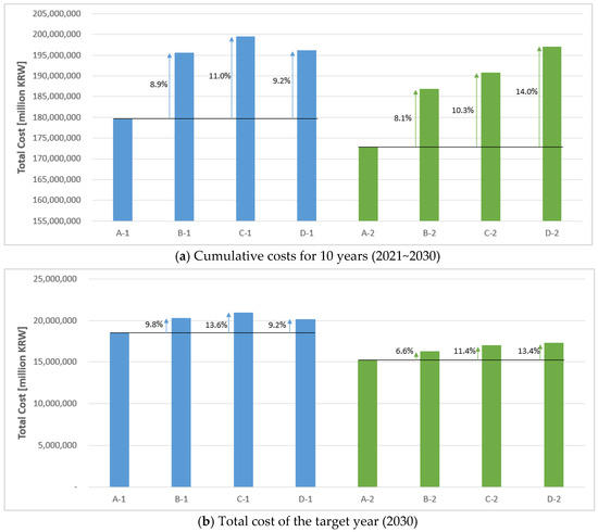 However, pumping load of D-1 was significantly smaller than in B-1, resulting in a lower total demand in the simulation than in B-1. Although the generation share increased by replacing coal with LNG, the total energy of D-1 was smaller than that of B-1, so the total generation cost was simulated to be lower in D-1 than in B-1, when compared to scenario A-1. However, the cumulative cost for 10 years was 109.2% for D-1 and 108.9% for B-1. On the other hand, C-1 and C-2 show that a slowdown in renewable investment can increase total costs drastically.