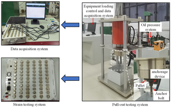 A QKX-MLB-500 bolt (cable) pull-out creep test system was adopted for the test, which was produced by Qingdao Qiankunxing Intelligent Technology Co., LTD in China. The maximum pull-out load of the test system is 500 kN, the maximum hold time is 72 h, and the vertical loading trip is 0~150 mm [31]. The programmed loading and unloading values and displacement value can be realized through the control system. Furthermore, using the built-in sensors and data acquisition system, all the data can be automatically stored and displayed in real time, and the data can be exported for further processing and analysis.