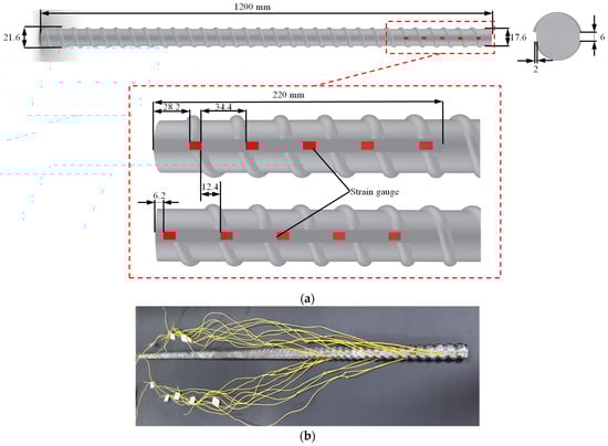 The cutting grooves, which were 6 mm wide, were processed along both sides of the axial direction of the bolt. The grooving surface was polished with fine sandpaper to remove the coating, such as paint, rust, and the oxide layer, and the patch was then scrubbed with absorbent cotton dipped in acetone. A strain gauge labeled A1 was arranged 6.2 mm downward from the end of the bolt on one side of the slot, a strain gauge labeled B1 was arranged 28.2 mm downward from the end of the bolt on the other side of the slot, and a strain gauge was arranged at an interval of 34.4 mm in each slot and numbered successively (A1–A5 on one side and B1–B5 on the other side). A total of 10 strain gauges were arranged on each force-measuring bolt, and the symmetrical spacing was 12.4 mm, as shown in Figure 3. By monitoring the strain gauge during the test, the variation in the axial force at different positions could be obtained, and the distribution law of interfacial shear force along the axial direction of the bolt could be obtained according to Equation (1) [32].