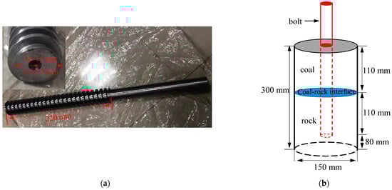 ABS engineering plastic test molds having a size of 150 mm × 300 mm (diameter × height) were used for this test, and material similar to the bottom of the surrounding rock, having a thickness of 80 mm, was laid at the bottom of the test mold to avoid the resin agent from flowing from the bottom of the borehole during the test. After surface painting, a customized steel rod with a thread was placed vertically in the center of the test specimen. Then, the surrounding rock (coal and rock) was used to fill the mold and tamped. Mica powder was sprinkled between the coal and rock to simulate the coal–rock interface. After it became solidified naturally (about half a day), the steel rod was screwed out along the thread to form a simulated borehole. This was placed in a dry environment for natural curing, thereby finally forming an anchor specimen for the pull-out test with a simulated borehole after a period of time. Figure 4 shows the dimensions of the steel rod and anchorage specimen.