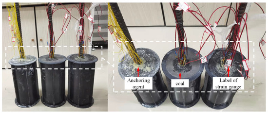 According to the above preparation methods of the force-measuring bolt and pull-out test piece, a total of 5 groups of anchor pull-out test specimens were prepared. After determining the strain gauge line of the prepared force-measuring bolt, the anchor test specimen was inserted vertically, the epoxy resin glue, which was mixed in equal proportion, was injected, and the coal–rock combined anchor body of this test was finally formed after it became solidified and cured naturally for a period of time, as shown in Figure 5.