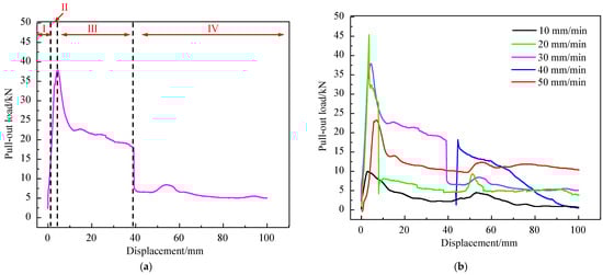 Figure 6. Relationship between pull-out load and pull-out displacement: (a) the four stages; (b) relationship between pull-out load and pull-out displacement at different pull-out rates.