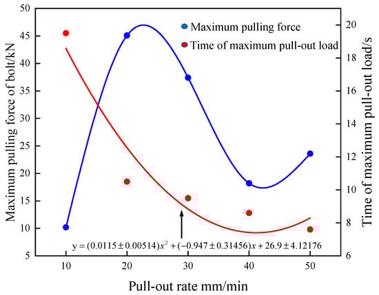 • With the increase in the pull-out rate, the maximum pull-out load of the bolt first increases, then decreases, and finally tends to be stable. The time to reach the maximum pull-out load decreases gradually with the increase in the pull-out rate, and finally tends to be stable. As shown in Figure 7, when the pull-out rate is 10~20 mm/min, it is at the growth stage. Due to the increase in the pull-out rate, the time is insufficient for the release of the load at the anchorage interface; energy accumulates rapidly and accelerates the failure of the anchorage interface. The pull-out load increases approximately linearly. When the pull-out rate is 20~40 mm/min, it is at the decline stage. Due to the existence of the coal–rock interface and the different media of coal and rock, the coal–rock combined anchor body shows heterogeneity and different strengths [27], resulting in the phenomenon where its elastic modulus and strength gradually decrease with the increase in the pull-out rate, and the pull-out load of the bolt decreases. When the pull-out rate is 40~50 mm/min, the influence of the increase in the pull-out rate on the pull-out load of the bolt is weakened, and the pull-out load of the bolt tends to be stable, which indicates that there is a critical pull-out rate for the coal–rock combined anchor body.