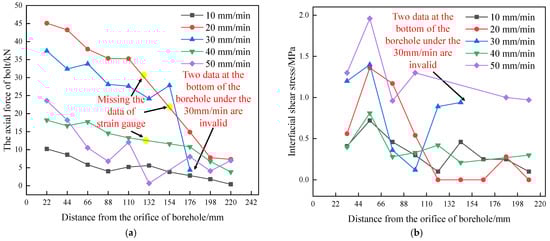 It can be seen from Figure 8a that, when the pull-out rate is constant, the axial force is unevenly distributed. As it is close to the bottom of the borehole, the axial force tends to decrease and shows a negative exponential distribution as a whole. When the pull-out rate is 0~20 mm/min, with the increase in the pull-out rate, the axial force from the end of the pull-out section to the middle of the anchor increases significantly, and the axial force changes little from the middle of the anchor section to the bottom. When the pull-out rate is 20 mm/min, the axial force from the end of the anchor section to the middle is greater than that at other pull-out rates. When the pull-out rate is 20~40 mm/min, the axial force from the end of the anchor section to the middle of the anchor section decreases with the increase in the pull-out rate, and there is no obvious change from the middle of the anchor section to the bottom. When the pull-out rate is 40~50 mm/min, the increase in the pull-out rate has little effect on the axial force of the bolt, and the axial force from the end of the anchor section to the bottom is in a certain range. Therefore, it can be said that, when the pull-out rate is 10~20 mm/min, the distribution curve of axial force on the bolt is steeper with the increase in the pull-out rate. When the pull-out rate is 20~40 mm/min, due to the existence of the coal–rock interface and the heterogeneity of the coal–rock combined body, the distribution curve of axial force on the bolt gradually flattens with the increase in the pull-out rate. When the pull-out rate is greater than 40 mm/min, the influence of the increase in the pull-out rate on the axial force of the coal–rock combined anchor body is gradually weakened.