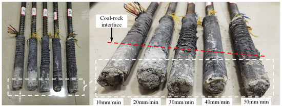 It can be seen from Figure 9 that, when the pull-out rate of the bolt is 10 mm/min, after the bolt is pulled out and damaged, part of the surrounding rock is pulled out due to the bonding of the anchorage agent. The thickness of the peeling surrounding rock is low. It can be clearly seen that the peeling surrounding rock at the coal–rock interface is larger than that at other parts, and its integrity is good. When the pull-out rate of the bolt is 20 mm/min, the thickness of the surrounding rock that is pulled out by bolt spalling obviously increases, and the integrity of the peeling surrounding rock at the coal–rock interface is poor. It can be seen that the damage degree at the coal–rock interface is the largest. When the pull-out rate of the bolt is 30 mm/min, the spalling out of the surrounding rock by the bolt is less than that at 20 mm/min, and the spalling out of the surrounding rock has less damage and better integrity. When the pull-out rate of the bolt is 40 mm/min, compared with that at 30 mm/min, the peeling out of the surrounding rock is still reduced, but the degree is small. Because the coal body is on the top during pull-out, the surrounding rock pulled out of the rock is dyed black, which indicates that the degree of damage of the coal body on the interior of the coal–rock combined anchor body is small. This is because the increase in the pull-out rate shortens the time for the coal and rock to reach the critical failure state; because the duration of pulling out on the bolt is short, the anchor body is damaged instantaneously, resulting in the surrounding rock falling off. As a result, the damage degree of the surrounding rock on the interior of the anchor is weakened and the failure interface is relatively smooth. When the pull-out rate of the bolt is 50 mm/min, compared with the case when the pull-out rate is 40 mm/min, the integrity of the surrounding rock and the thickness of the peeling surrounding rock are little different, and the failure interface is relatively smooth.
