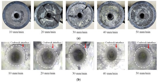 Figure 10b shows the results of borehole peeping. From the analysis, it was found that, under the pull-out rate of 10 mm/min, the damage degree of the borehole is small, and the damage can be obviously seen on the coal–rock interface, whose damage degree is greater than that of other parts of the borehole. Under the pull-out rate of 20 mm/min, the damage degree of the borehole increases obviously, and the damage on the coal–rock interface is large. The whole borehole is divided into two parts with the difference in damage degree. Coal, which is the upper part, has large cracks due to its low strength and high damage degree. Although the failure section of the lower rock part is uneven and rough, the damage is relatively small. Under the pull-out rate of 30 mm/min, compared with the pull-out rate of 20 mm/min, the degree of borehole damage is reduced, but it is still divided into two parts, which are the upper and lower parts of the coal–rock interface. There are still large cracks in the upper coal body, the surrounding rock is broken, the lower rock body is somewhat smooth, and the degree of borehole damage is weakened as a whole. Under the pull-out rate of 40 mm/min, the borehole becomes smooth, although the coal–rock interface is clearly visible, there is no major damage, the integrity of the surrounding rock is good, and there is no crack, which is consistent with the failure of the bolt specimen. Under the pull-out rate of 50 mm/min, compared with the pull-out rate of 40 mm/min, there is no significant change, and the integrity of the surrounding rock is good, with the exception that there is a little damage on the coal–rock interface; in addition, the wall of the borehole is smooth, and there is no cracking or obvious damage in the surrounding rock.