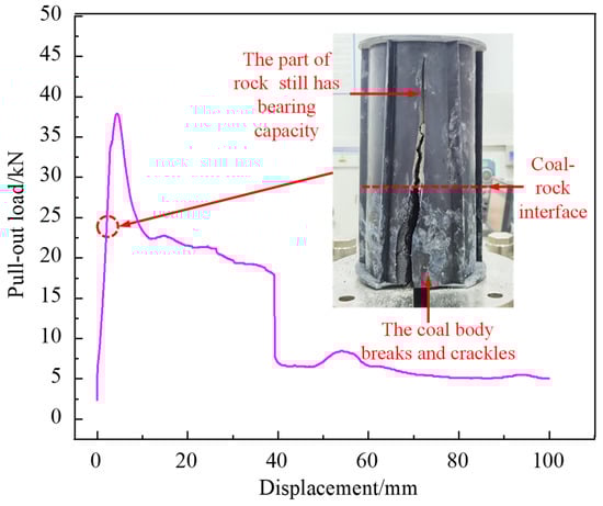 Existing research shows that [28], when the loading rate is too low, the failure of coal–rock combined body is mainly due to the failure of coal. When the loading rate is high, the failure of the coal–rock combined body occurs because the coal and rock break together, but the fragmentation of coal is more severe. Due to the different strengths of coal and rock, the bolt is finally in the pulled out state. Combined with the failure process of the pull-out test of the bolt on the coal–rock combined anchor body, under the pull-out rates of 20 and 30 mm/min, the partial failure of coal causes cracks in the PVC test model with a crackling sound, but the pull-out load is still in the growth stage (Figure 11). This shows that the coal is damaged at this stage, but the rock still has bearing capacity. That is, there is a difference in the times of the destruction of coal and rock in the pull-out process of the coal–rock combined anchor body, and the coal–rock combined anchor body undergoes time differential development of cracks. The failure of the coal–rock interface is particularly obvious. In the process of the pull-out failure on the bolt, the existence of the coal–rock interface plays an important role in the bolt’s overall tension shear failure.