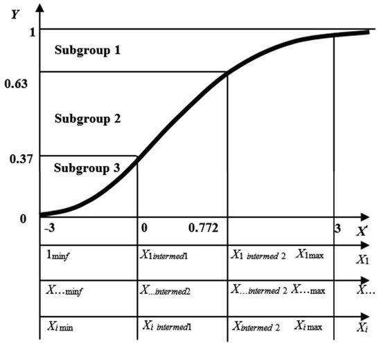 Non-linear subdivision of the statistical population into subgroups. On the basis of the proposed methodology, the statistical population under consideration may be divided into the desired number of subgroups. In a specific case, it will be divided into three sub-groups and, according to Equation (5), it will be divided into five groups.