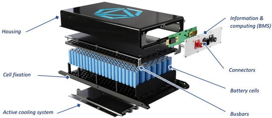 A typical battery system (see Figure 1) consists of multiple battery cells that provide an electric current via a reversible chemical redox reaction. The cells are held in place by a mechanical construction that also protects the cells from external influences. The cells are electrically connected, e.g., via a plate, to provide power at the specified voltage and current, and to allow charging of the cells. A battery management system (BMS) is integrated to make sure cells are not used outside safe operating conditions, e.g., maximum flow of current, minimum and maximum voltages, and specific temperature ranges. Based on measurements, the BMS can calculate the status of the cells, manage (dis)charging, and shut off the battery when dangerous states are reached. The thermal management system, often consisting of a passive heat-conducting plate, regulates the temperature of the cells. Although this configuration is quite typical, a large variety of batteries exist with differences in chemistry, design, shape, power, cells, cooling solutions, and integration in applications [5,44,46,52].
