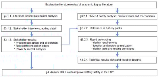We first explore the literature on battery safety to introduce key concepts related to battery packs and battery fire safety, and then identify the research gap. Next, we outline the research methodology (Section 2). First, we study the problem setting and stakeholders’ roles through literature review and stakeholder interviews (Section 3.1). We do so in order to better understand the problem and construct a power–interest diagram to identify which stakeholders have the power and interest to influence ongoing developments. This is followed by failure mode analysis, a technical analysis of potential failure events and mechanisms (Section 3.2). Both this analysis and the stakeholder analysis indicate the crucial relevance of battery packs to ensure battery safety, especially for diverse niche applications. Therefore, the approach is complemented by a rapid prototyping approach (Section 3.2). We do this to confront the problem setting and stakeholder preferences with the technological possibility space. It is a quick scan approach to identify the most appropriate and feasible technical solutions. Finally, we combine the insights in an integrative discussion along with our conclusions, in which we address the potential strategies and stakeholder roles that could improve battery safety (Section 4).