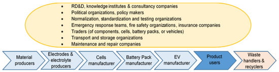 The safety risks of batteries might be the result of (in)actions, lack of coordination or failing quality assurance in the production value chain, (mis)use or damage of batteries, or how they are handled in the waste processing stage. As such, battery safety is not only a concern for market parties and users, it is also a matter of public concern, regulation, and innovation and, as such, involves stakeholders like the EU and national governments, as well as norm developers and testing centers that affect the different stages of production and use [10,12,19,81]. The most important stakeholders are identified in Figure 3.