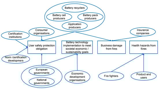 The wide variety of stakeholders involved in the issue of battery safety have different roles and hold different interests, which is reflected in the stakeholder–issue diagram—see Figure 4.
