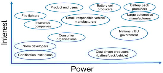 The results of both the literature study and interviews were interpreted and represented in a stakeholder-issue map as well as a stakeholder map based on power and interest [69]—the latter reflecting which stakeholders can have a strong influence and interest in influencing ongoing developments regarding battery safety.