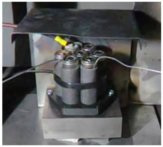 All tests were conducted in an airtight, steel box that contained an overpressure valve, an exhaust, and a window for monitoring the experiment, as well as an action camera to record the cells during the experiment. The prototypes were equipped with heat sensors and with wiring to overcharge the trigger cell. For positioning the cells in the battery pack at 2 mm distance between themselves, a small plastic plate with holes was used either at the top or bottom (see Figure 6).
