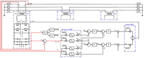 The proposed control strategy uses the IT current and the voltage difference V1 − V2 as feedback variables. The proposed converter controller is based on the MSRF [36] technique, as presented in Figure 1, and the AC system variables are converted into continuous variables (Vd and Vq for V1 − V2) and (id and iq for IT for the feedback, synchronized with V1 (by the MSRF-PLL [36]), to be used in the cascaded PI controllers (for d and q axis).
