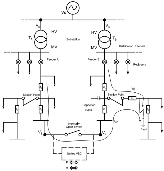 One should note that distribution grids do not have a large variation in the phase angle difference between close feeders when they come from the same main source [28]. Distribution lines are relatively short compared to transmission systems. Instead of using a back-to-back converter, a small-rated series VSC could provide a low-cost approach because only a fraction of the system voltage is needed for loading flow manipulation, even though this approach is not as flexible as the BTB converter [29].