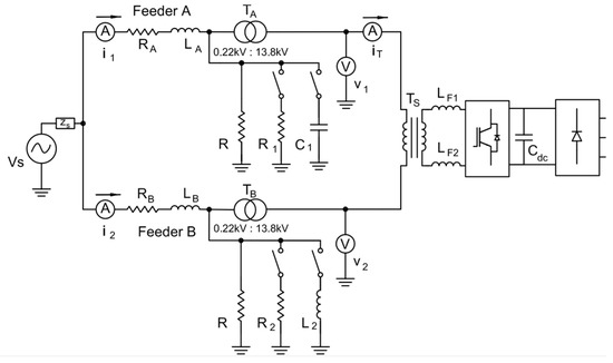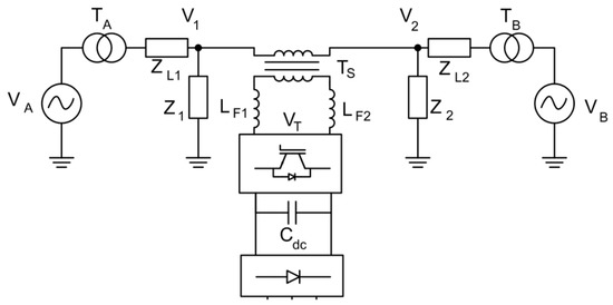 If we are not interested in the load flow behavior and the values of each voltage node in this system, it is possible to obtain an equivalent representation, as shown in Figure 3, using Thevenin’s representation for each distribution feeder, where VA and VB are the main feeder voltage sources, TA and TB are the main step-down transformers, ZL1 and ZL2 are the distribution line impedances, Z1 and Z2 are load impedances, LF1 and LF2 are the converter switching filter inductances, TS is the coupling transformer, and Cdc is the series converter DC-link capacitance. V1, V2, and VT are the terminal voltages and the converter’s imposed voltages, respectively.