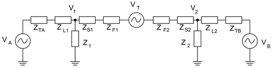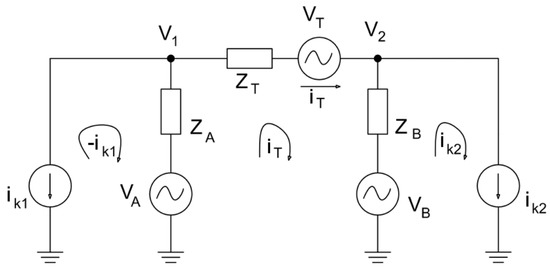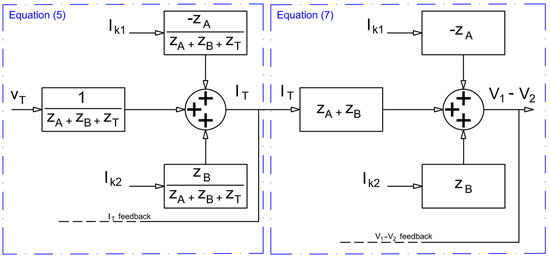 The simplified representation can be derived from Figure 5 with the loads represented as current sources (ik1 and ik2) as a function of the terminal voltages V1 and V2 and the load impedances (i.e., ik1 = V1/Z1 and ik2 = V2/Z2). Additionally, the equivalent transformer models can be added to the line parameters for further simplification. Figure 5 shows the reduced model where ZA = ZL1 + ZTA, ZB = ZL2 + ZTB and ZT = ZS1 + ZF1 + ZS1 + ZF2.