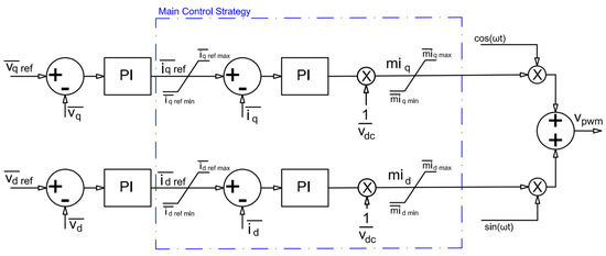 The main control strategy (current control) is shown in Figure 7, which alone can choose the desired power transfer. Thus, id and iq are the active and reactive currents, respectively. The current control (derived from Figure 1) composed of two P.I. controllers that track the current transfer (id and iq) is compared to the reference values (idref and iqref) generating the control signals (modulation indexes (mid and miq), which are multiplied by unity vectors sin (ωt) and cos (ωt) that are added to provide the voltage reference signal Vpwm for the unipolar PWM. Furthermore, the outputs from the P.I. controllers (of the current controllers) have saturation limiters (miqmin, miqmax, midmin, and midmax) defined between +1 and −1. The current reference values also have limiters (idrefmin, idrefmax, iqrefmin, and iqrefmax) which are defined based on the converter’s power rating.