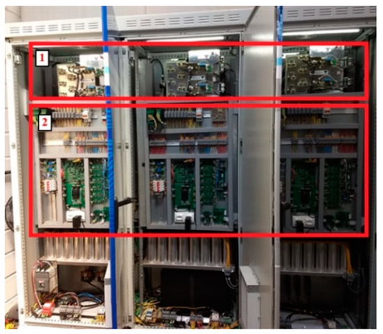 Figure 9 shows a picture of the internal electronics composed of three single-phase full-bridge converters (indicated as #1). Basically, this equipment comprises 3 single-phase 37.5 kVA 3:1 coupling transformers, and three independent full-bridge DC-AC converters, with a 500 kVA power transfer capacity.