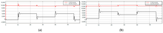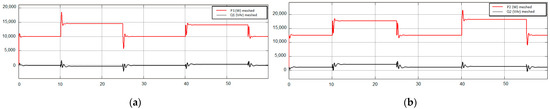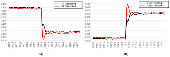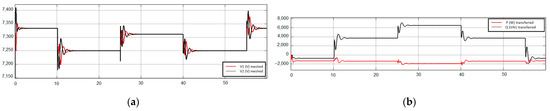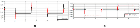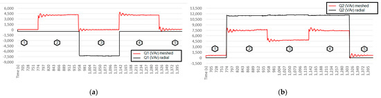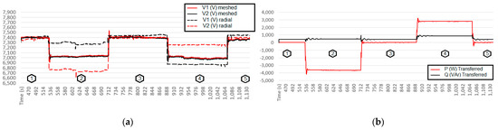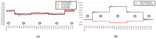 Figure 22a,b show the simulation results. The constant active power presented in the simulations shows that only reactive loads were inserted/removed in this test, but a constant load R is maintained in both feeders (Figure 11) during the reactive load transitions.