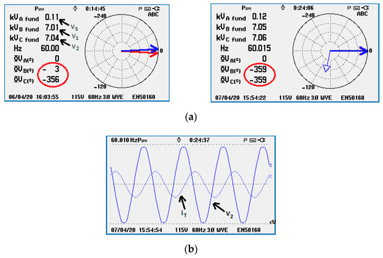 Figure 20a presents the phase graph for stage 3, which shows that, without the radial converter operation for these distribution line parameters, inserted reactive loads show predominant phase angle variations. Figure 20b shows the state of stage 3 with the series converter transferring power to compensate for the achieved phase angle difference via the reactive loads. Additionally, one should note that in stage 3 capacitor C1 is inserted into feeder A, and inductance L2 is inserted into feeder B, to compensate for the inductive reactive power of both feeders using the series converter.
