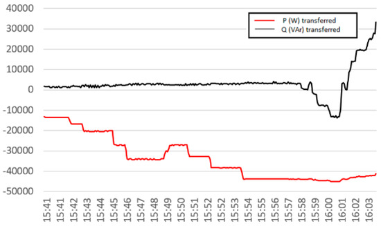 At the beginning, the reactive power reference was maintained at 0 VAr while the active power was changed in small steps. After 15:57 (indicated in Figure 24), the active power was fixed at approximately 45 kW while the transferred reactive power was manipulated in both directions showing the independent P and Q manipulation for the proposed control strategy, validating the presented formulations of this study also in a real field system.