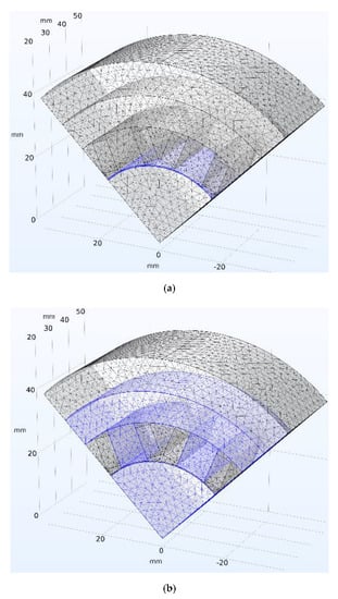A division into three air groups is a result of the discretisation of space (Figure 6). The nominal air gap equals 0.25 mm, and this space is more important in the bearing model (Figure 6a). The mesh must be dense, and the triangle elements small enough. The next groups have larger-sized triangle elements. This approach simplifies the bearing model.
