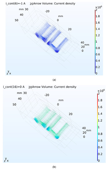 Figure 7 presents the distribution of the current density in the coils. The direction of current in the coils is a crucial parameter for the model. There were two coils in the electromagnet. The coils must be connected in series and ensure magnetic flow flux between the electromagnet poles. If the coils are incorrectly connected or have a wrong direction of current magnetic flux density, the magnetic path is reduced to zero. The next important property is ensuring the constant magnetic polarity of the electromagnet in the full range of the control current. Figure 8 shows the distribution of magnetic flux density. The streamlines ensure the magnetic flow flux has the same direction and the value of flux changes depending on the control current. Figure 9 presents the distribution of the module magnetic flux density. Figure 8 and Figure 9 show the magnetic flux concentration in the cross-section teeth and armature. There are strong concentration lines in the corners. This phenomenon is known as the magnetic notch. The analysis results show that the tested magnetic bearing had a strong magnetic notch and the bearing value of the cross-section was enough to ensure the magnetic and electrical parameters of the mechanical properties of the bearing. The distribution of magnetic flux density along the length of a magnetic bearing is presented in Figure 10.