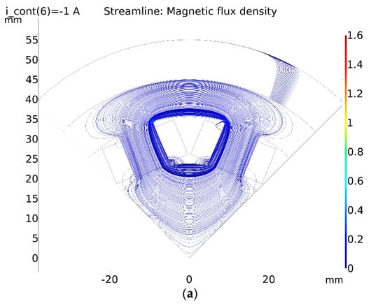 Streamline magnetic flux density for the control current of −1 A (a), 0 A (b), and 1 A (c).