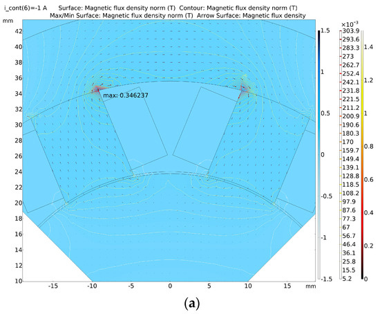 The magnetic parameters for different control currents are presented in Figure 11. Those parameters were obtained along with a symmetry axis of the teeth. The axis was perpendicular to the rotor–shaft axis of symmetry. Figure 11a shows the distribution of the magnetic flux density. However, the magnetic field had an impulse in the air gap (radius from 23.75 to 24 mm), as seen in Figure 11b. This impulse came from moving the magnetic flux by a zone of high magnetic resistance (the air gap). The bearing stator and the magnetic race of the rotor–shaft were made of silicon steel. The magnetic resistance of air is greater than steel. Thus, a strong difference in magnetic potential was observed between the rotor and the pole of the electromagnet. The large magnetic resistance of the air reduced the magnetic flux density in the air gap, as is presented in Figure 11a.