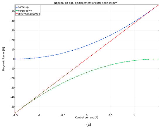 The static characteristics were obtained as a function of the control current for different displacements of the rotor–shaft raceway in the air gap. The non-parametric model determines the magnetic forces which support the rotor shaft. The actuator of the magnetic bearing consists of two electromagnets, so the model calculates magnetic forces generated by the upper and lower electromagnets and the resultant differential magnetic force as: