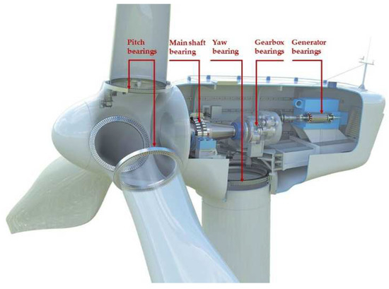 Wind energy has seen significant development in the past decade and is currently the most promising renewable energy resource. Notably, offshore wind turbines have better wind resources and wide operating space for large turbines than onshore ones. However, due to the harsh offshore environment, the failure rate of offshore wind turbines is much higher than that of onshore ones [1], which is an essential factor for the high cost of offshore wind energy. It has been observed there is a high failure rate of bearings in wind-turbine drivetrains as well as pitch-and-yaw systems, as shown in Figure 1. These bearings are continuously affected by alternating impact forces and loads from complex wind and wave environments, in which mechanical faults may occur. Therefore, advanced fault detection is required for evaluating the operating conditions of the bearings, so that maintenance can be implemented timely before catastrophic faults happen, and the operation and maintenance costs for offshore wind energy can be reduced [2].