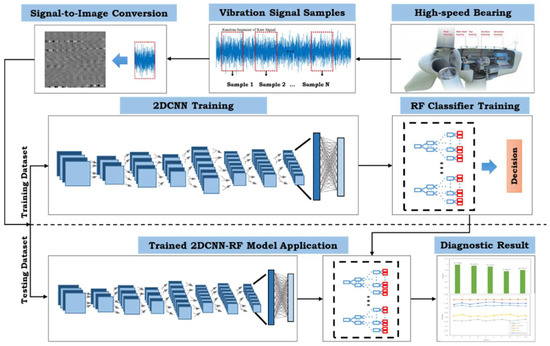 As shown in Figure 6, the feature-extraction outputs (128 values in our study) of 2DCNN are fed into the RF classifier for training. Once the RF classifier is well-trained, it performs the recognition task and makes decisions and outputs the classification results on high-speed bearing-fault diagnosis.