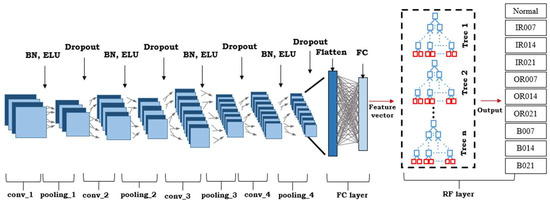 As illustrated in Figure 6, the structure of the proposed 2DCNN-RF model combines the CNN feature extractor and the RF classifier. It contains four-layer convolution-pooling structures, a fully connected layer, and an RF layer. After converting the vibration signals into 2D grayscale images, four-layer convolution-pooling structures are used for feature extraction. To alleviate the effect of gradient exploding and overfitting and to improve the 2DCNN feature-extraction performance under a noisy environment, three procedures, including batch normalization (BN), exponential linear unit (ELU), and dropout, are introduced in the model. When the 2DCNN feature extractor is trained, the obtained feature vectors will be passed to the RF as a new training dataset for learning and classification.