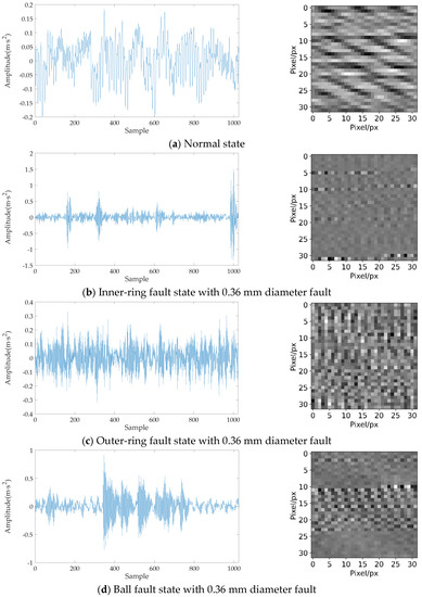 CNN is constructed by imitating a biological visual-perception mechanism, so it is more suitable for learning features from the 2D images. To achieve better diagnosis performance, the raw 1D time-domain vibration signals are transformed into 2D grayscale images. The benefits of this 1D-2D transformation is that it does not require noise suppression, and no signal information is lost. The process of the vibration signal-to-image conversion is shown in Figure 5.