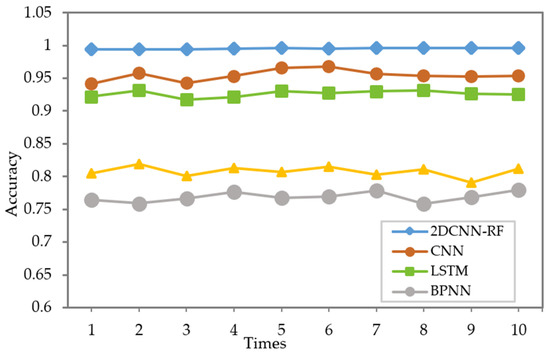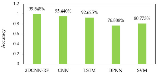 All the tests were conducted 10 times on the dataset listed in Table 1, and the fault diagnosis results are listed in Figure 9 and Figure 10, while the mean prediction accuracy is seen as the general evaluation indicator for this comparison. It can be seen that the average diagnostic accuracy of the proposed 2DCNN-RF model is 99.548%, which is better than those of other models. Compared with the standard CNN, the 2DCNN-RF model improves the diagnostic accuracy by 5%. Another deep-learning model, LSTM, has a diagnostic accuracy of 92%, since its diagnosis performance depends heavily on manual feature extraction. The accuracy of the BPNN and SVM are 76.88% and 80.773%, respectively, which are significantly worse than those of the deep-learning-based approaches. It can be seen that these machine-learning-based models cannot explore the inherent complex relationships between the fault features and the vibration signals.